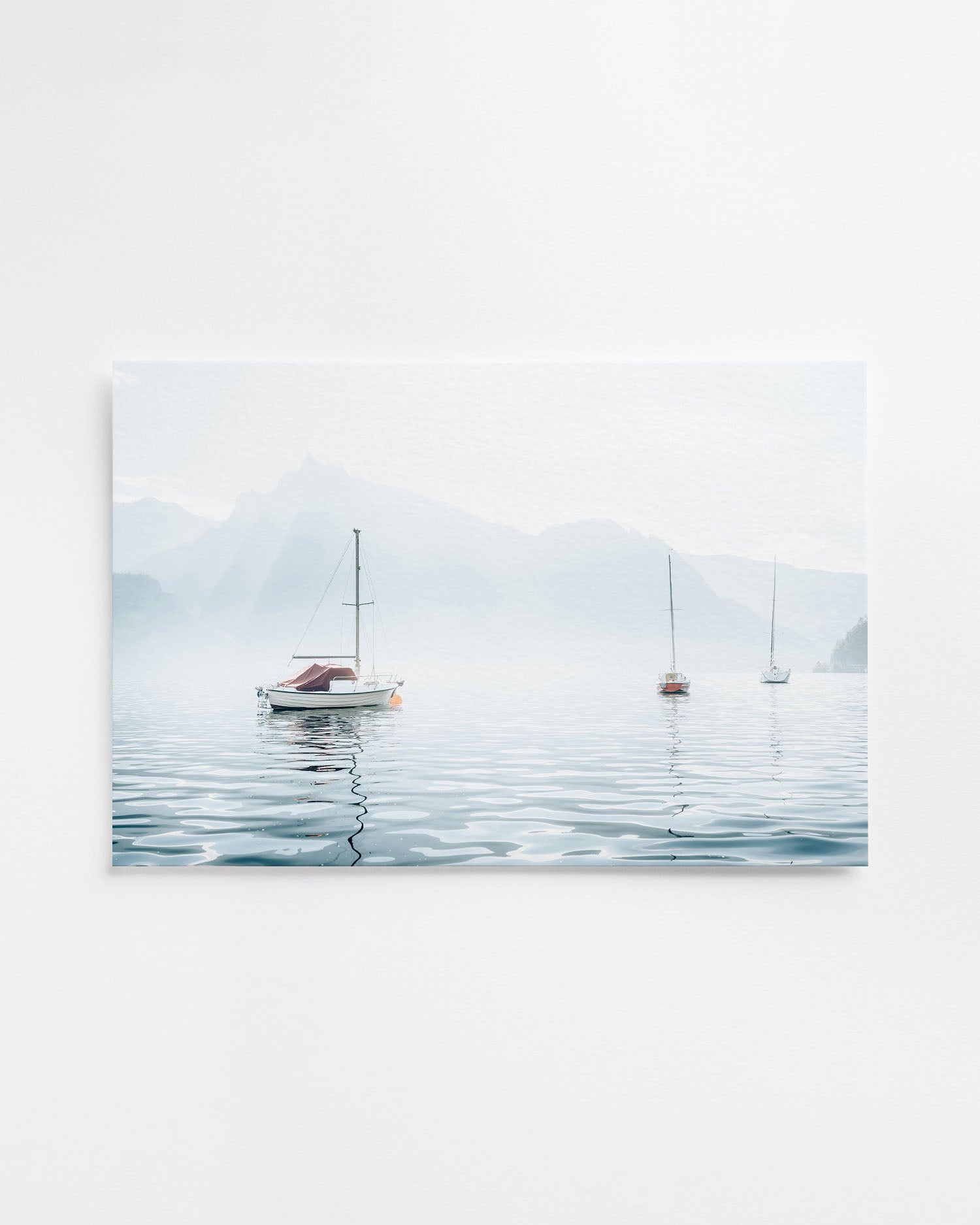 Blue Lake With Sailboats Floating Peacefully On Calm Water Fine Art Print
