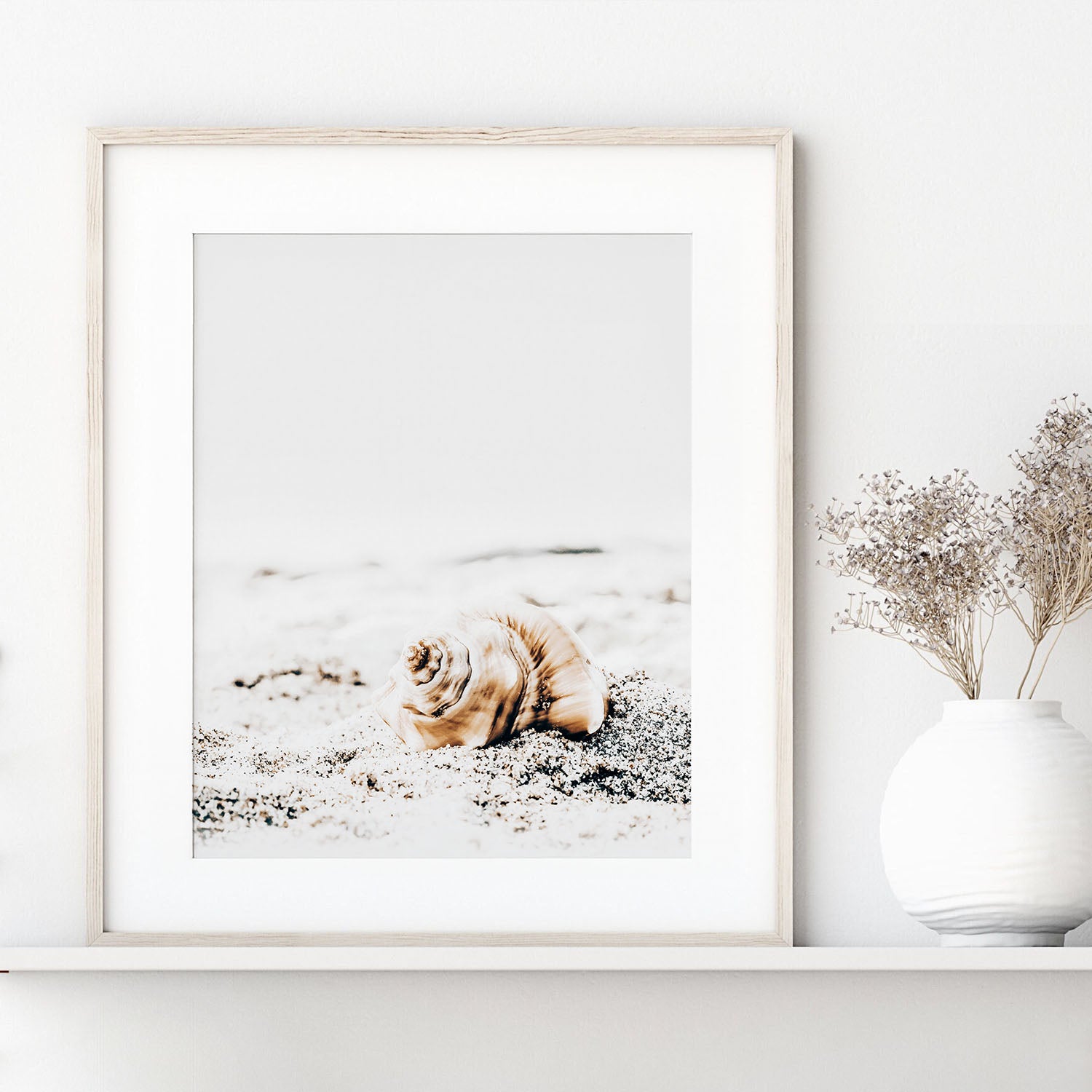 Bring a quiet sense of calm to your space with this soft, minimalist photograph of a seashell in the sand. Inspired by slow coastal living, this fine art print adds a serene, nature-inspired touch to any room.