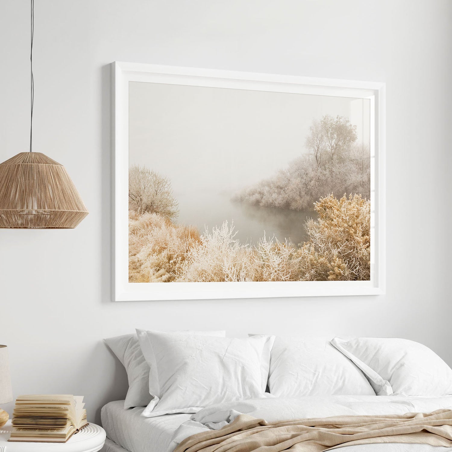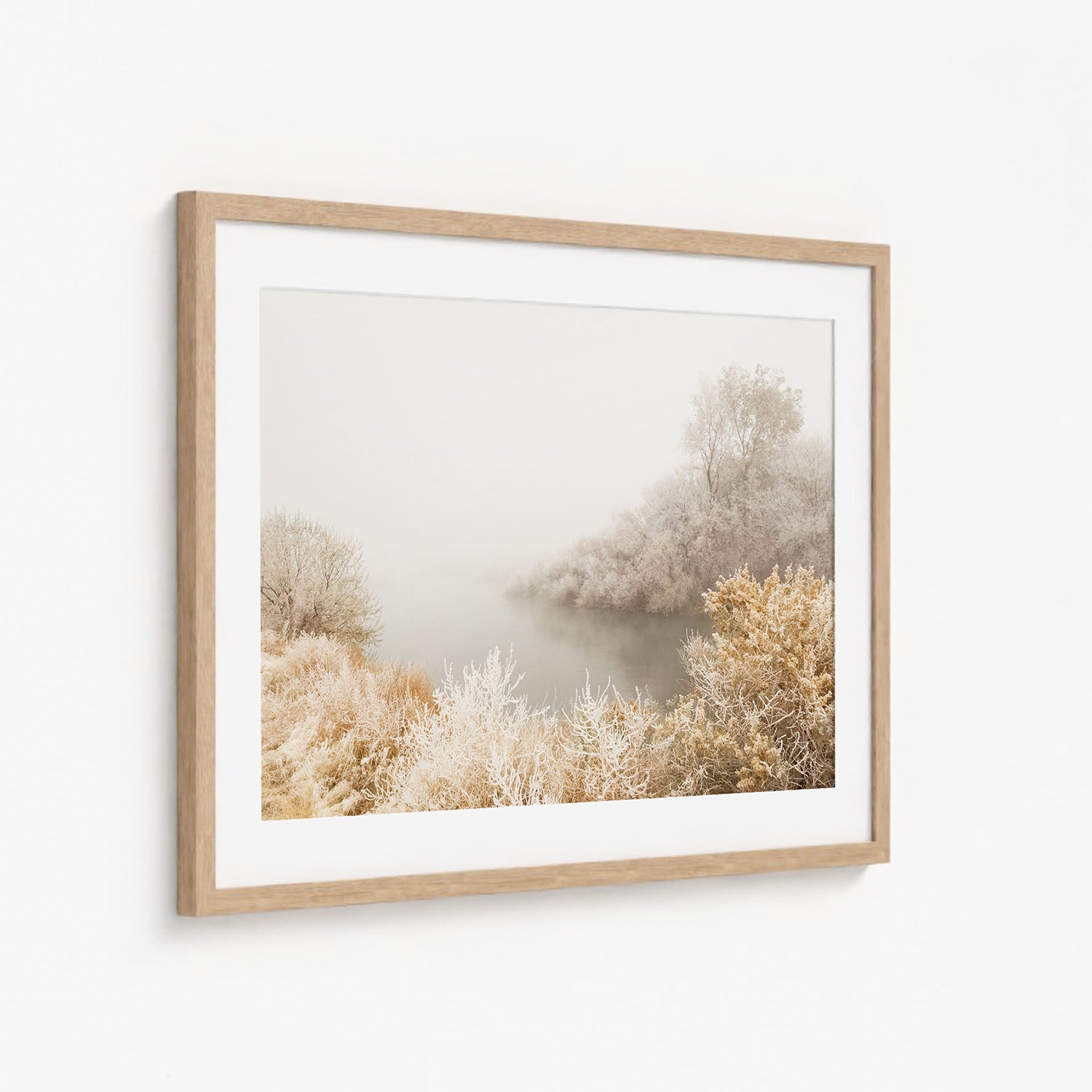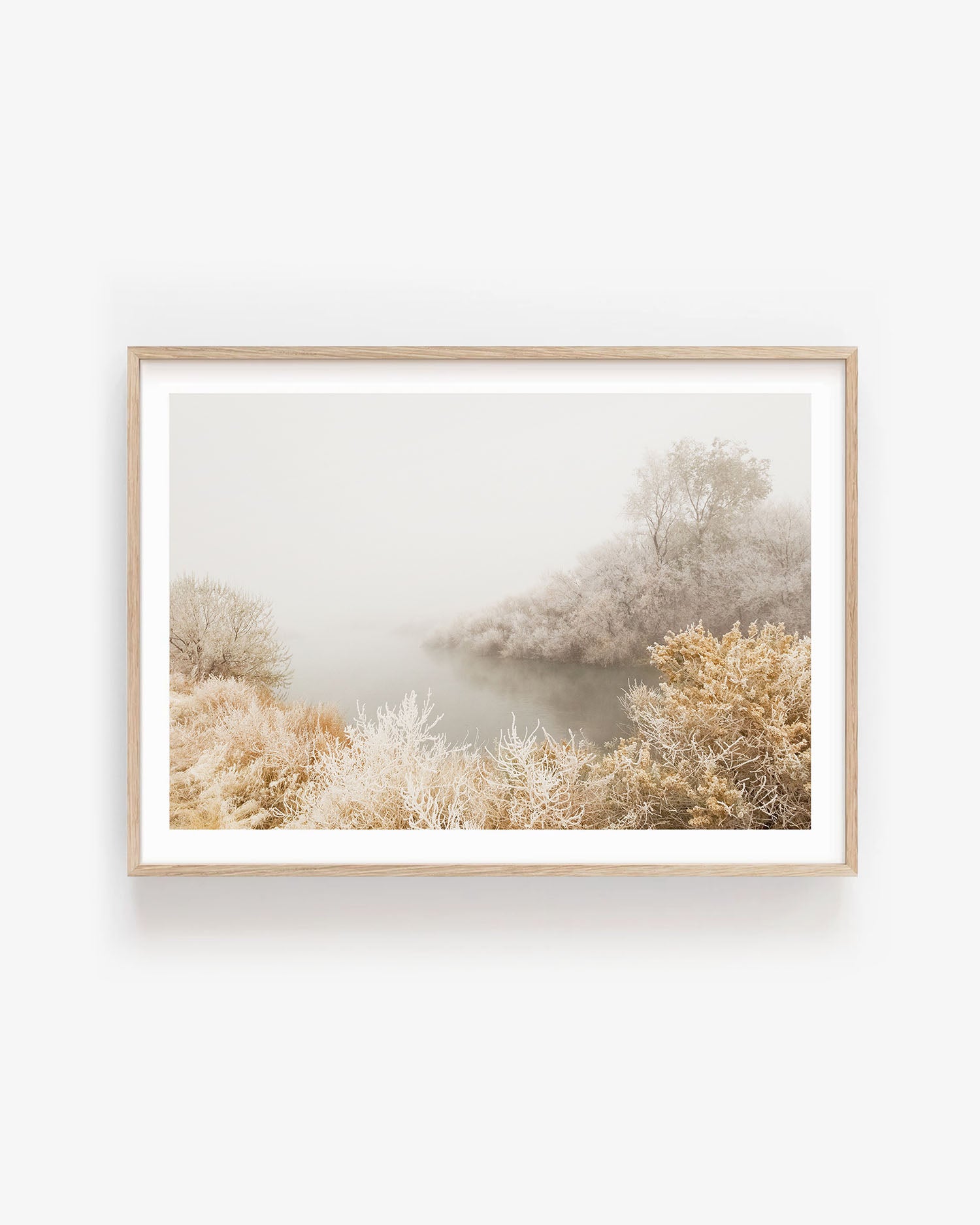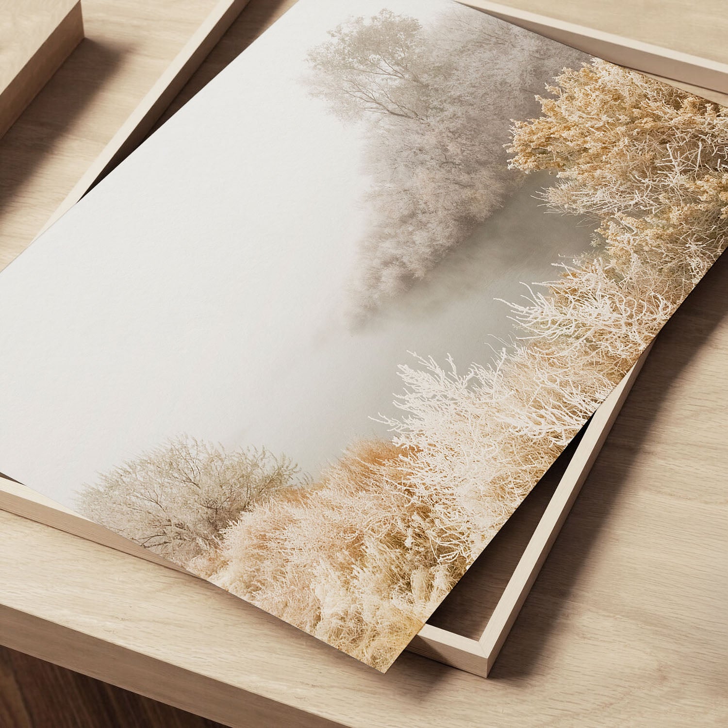 Caught between autumn’s last whisper and winter’s first breath, this fine art photograph captures a frosted river wrapped in soft mist and quiet light. This artwork feels like hitting the pause button - serene, neutral, and perfectly minimalist.