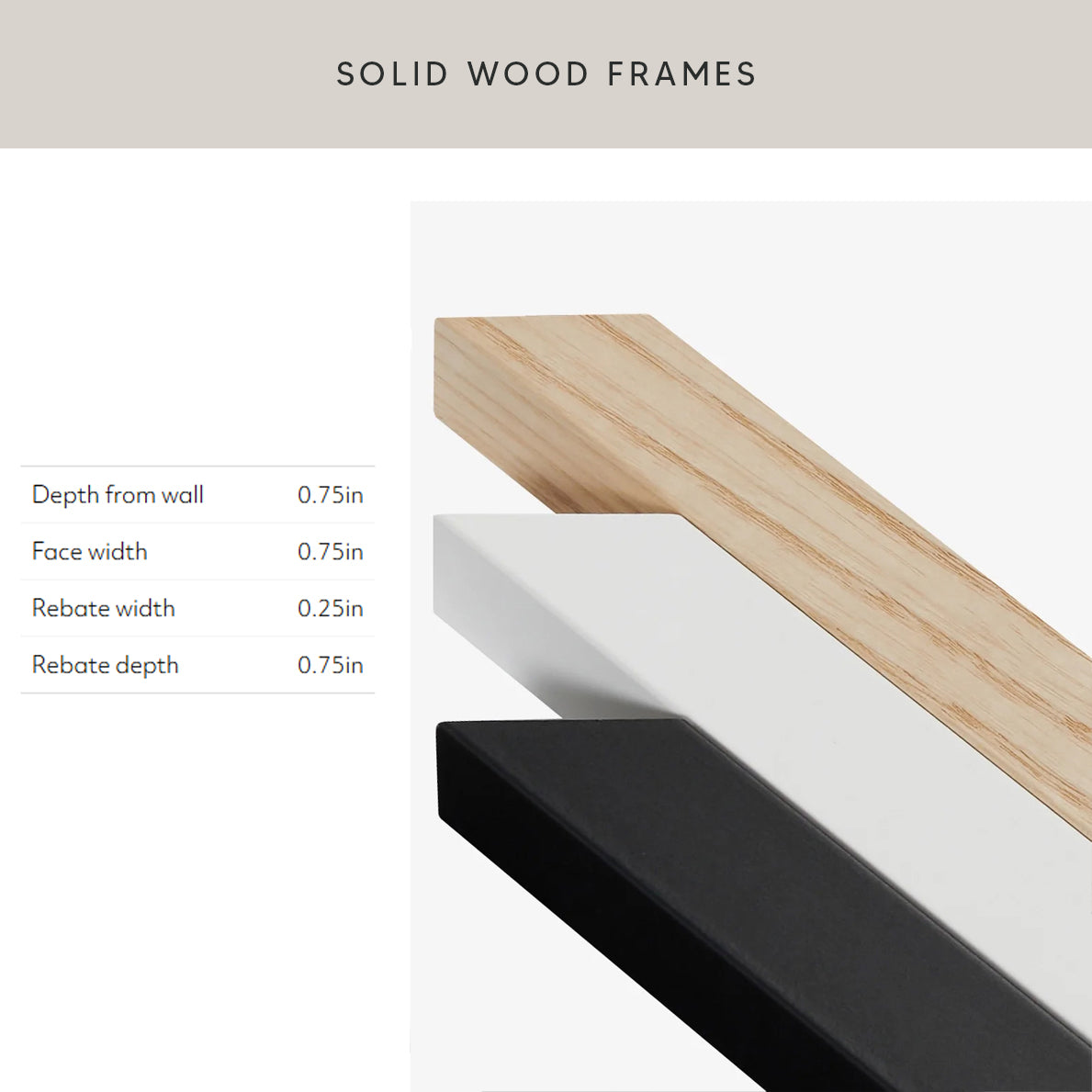 Our premium hardwood frames are expertly handcrafted from 100% natural, FSC-certified wood and are available in black, white, gold, and natural wood finish. CLICK HERE for more details.