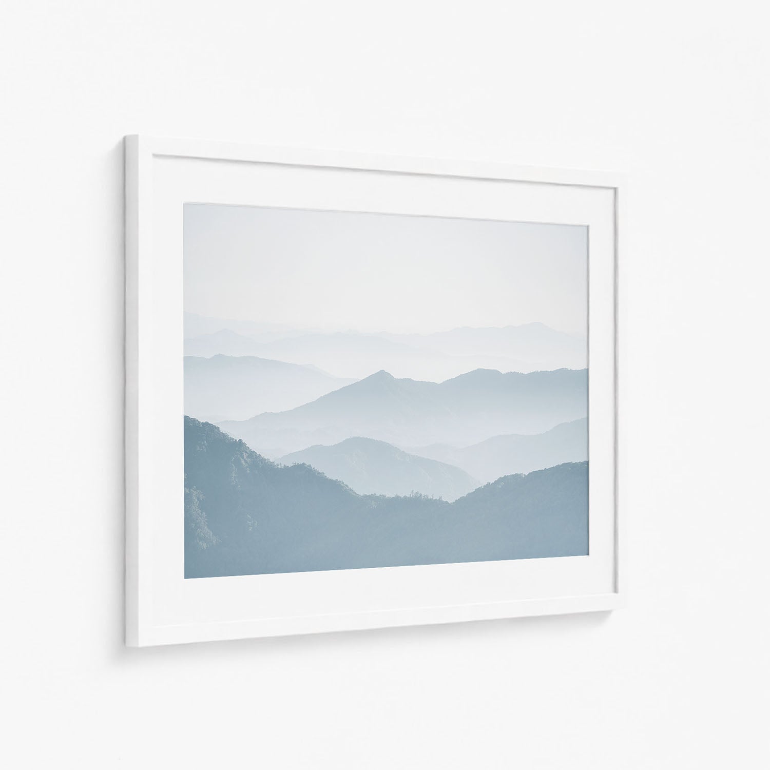 This fine art misty mountain wall art captures the quiet poetry of layered blue ridges fading into soft morning haze. With its minimalist composition and cool tones, this blue mountain landscape print adds calm sophistication to any space.