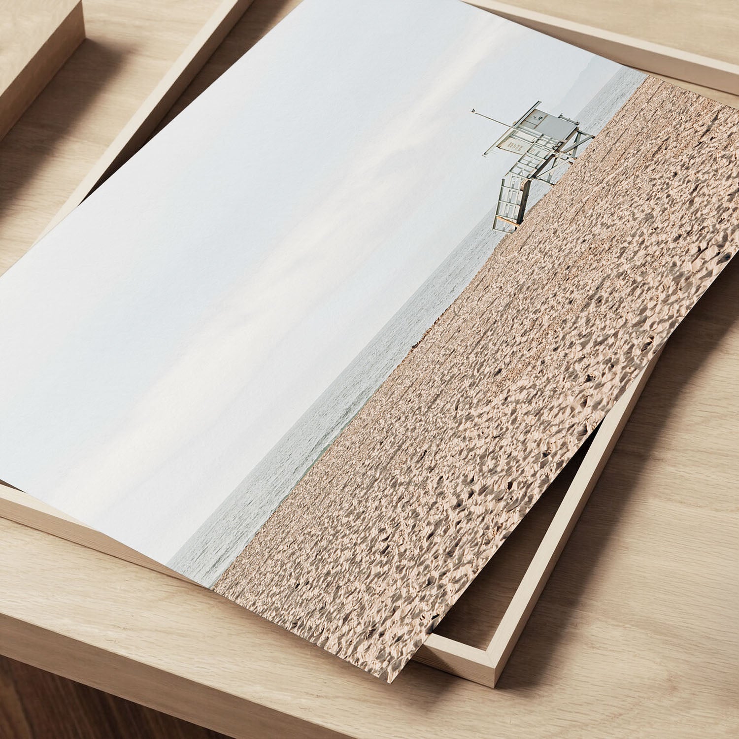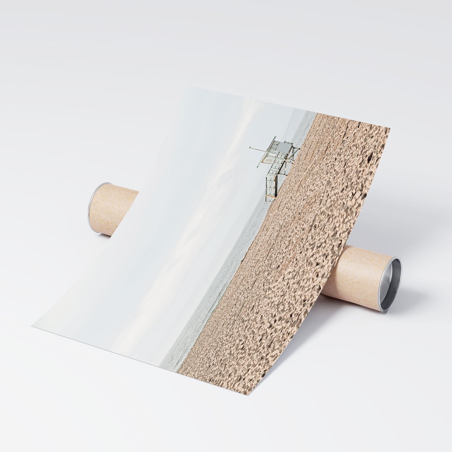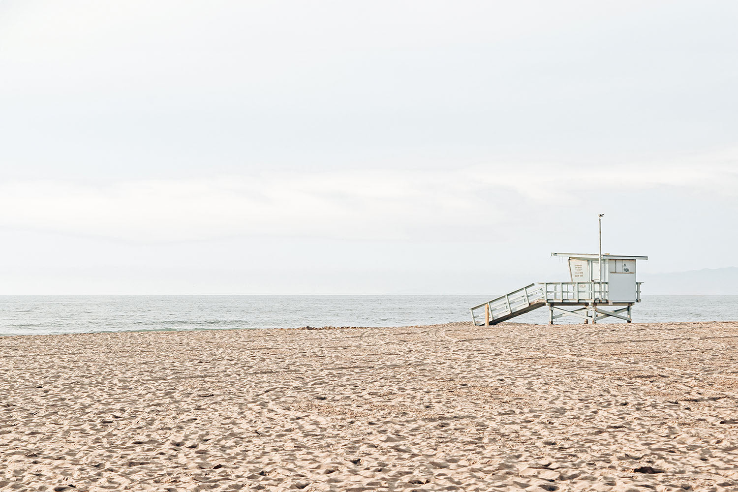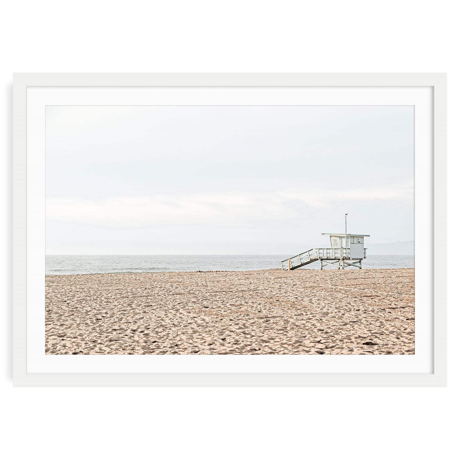 Manhattan Beach lifeguard tower on sandy beach under clear sky fine art print.
