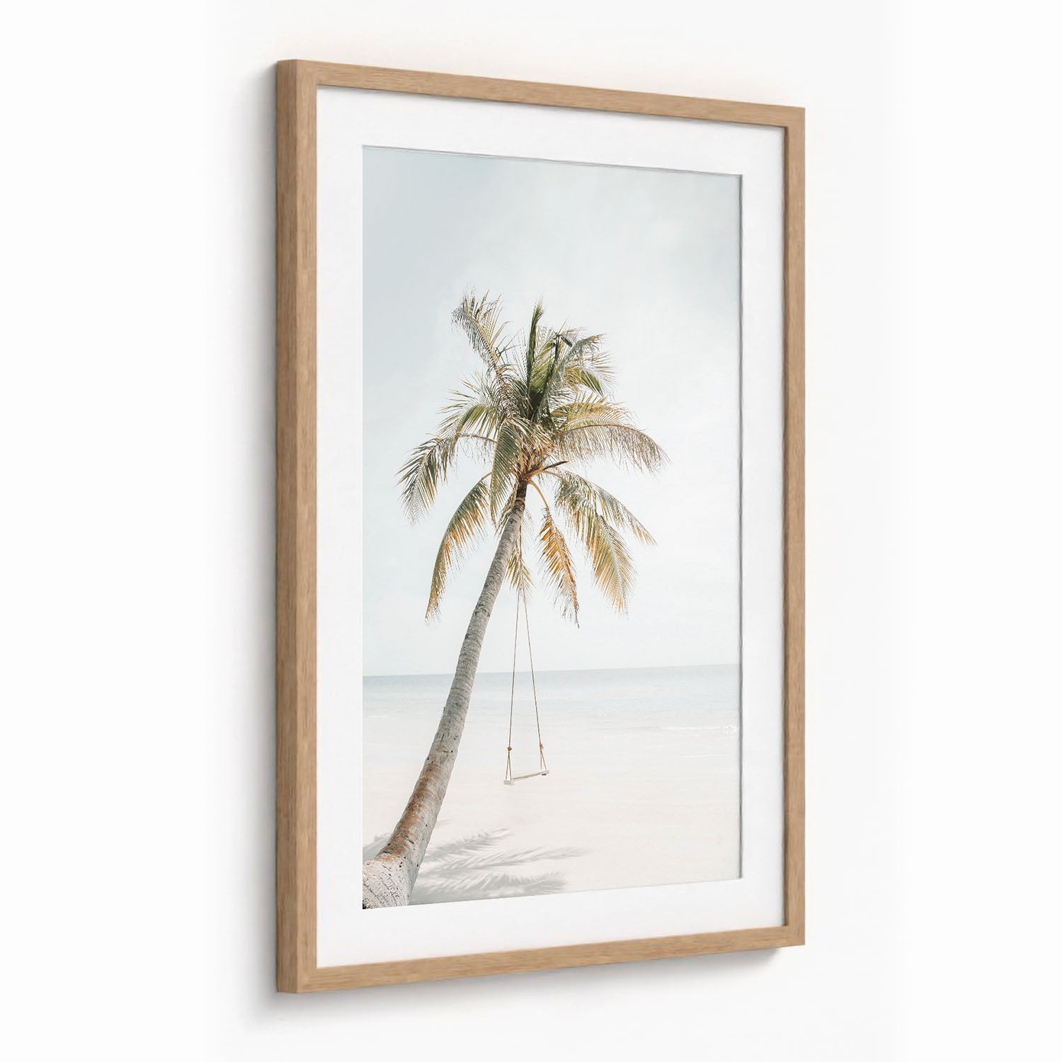 This fine art beach wall art print captures the quiet simplicity of a palm tree swing overlooking soft sand and open horizon, evoking a timeless coastal calm. With its minimalist style and tropical charm, it brings a touch of serenity and warmth into any interior with light, airy aesthetic.