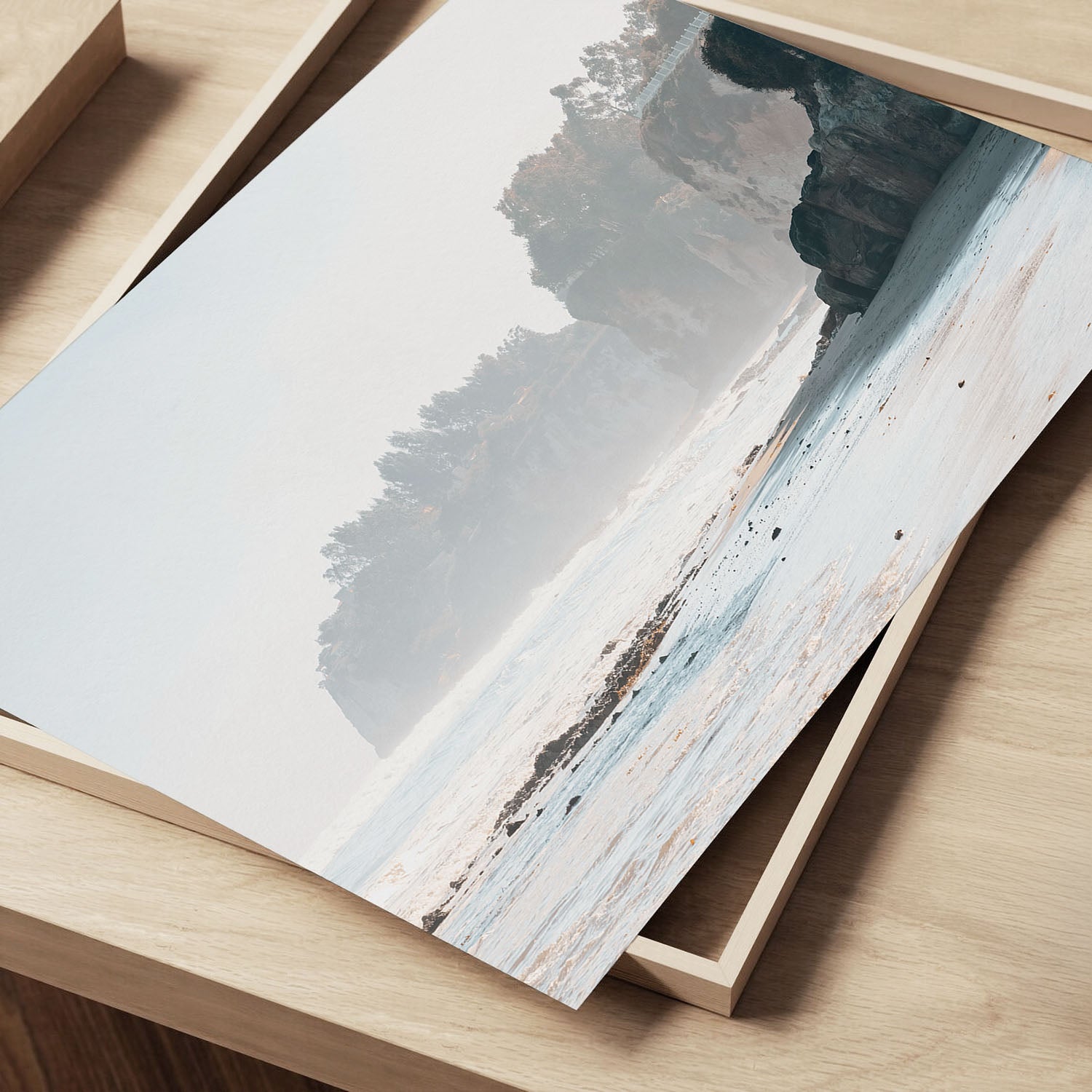 This coastal wall art captures the serene beauty of Malibu Beach, with soft ocean waves gently rolling onto a sandy shoreline. The misty atmosphere brings a sense of calm and tranquility, making it a perfect addition to bedrooms, living rooms, or a peaceful office space. Its soft tones and minimalist style blend seamlessly with modern, coastal, and beach-inspired interiors.