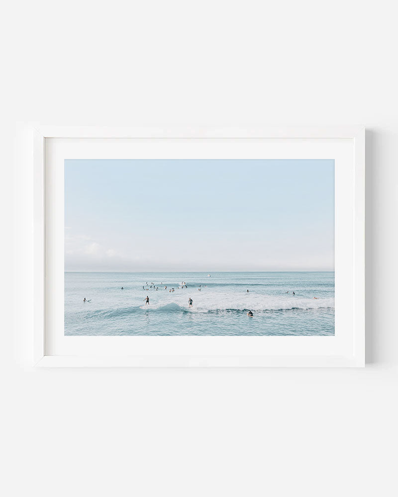 A relaxed ocean scene capturing a busy surf lineup on a calm, clear day.