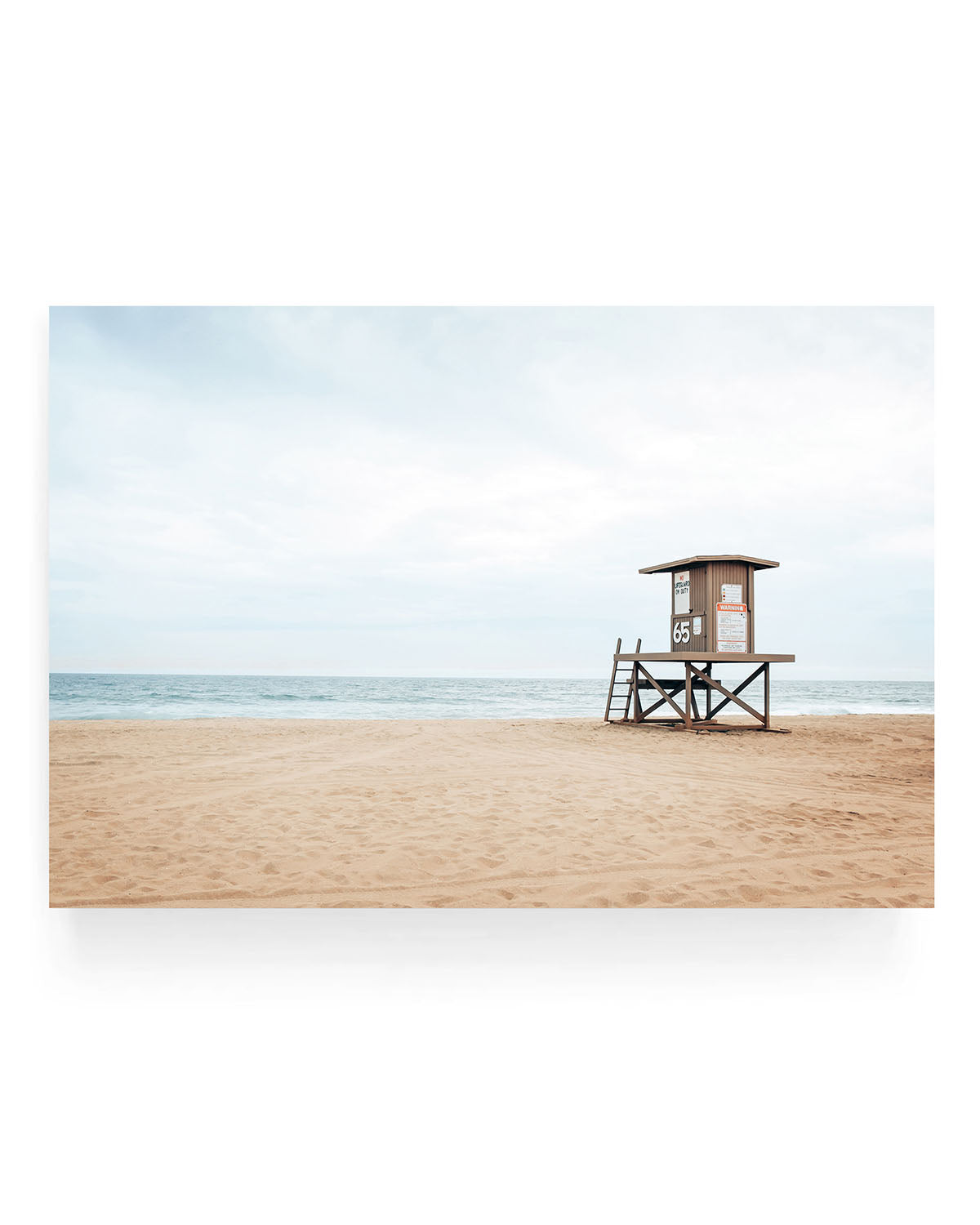 A calm coastal scene capturing a solitary lifeguard stand beneath a wide, pale sky.