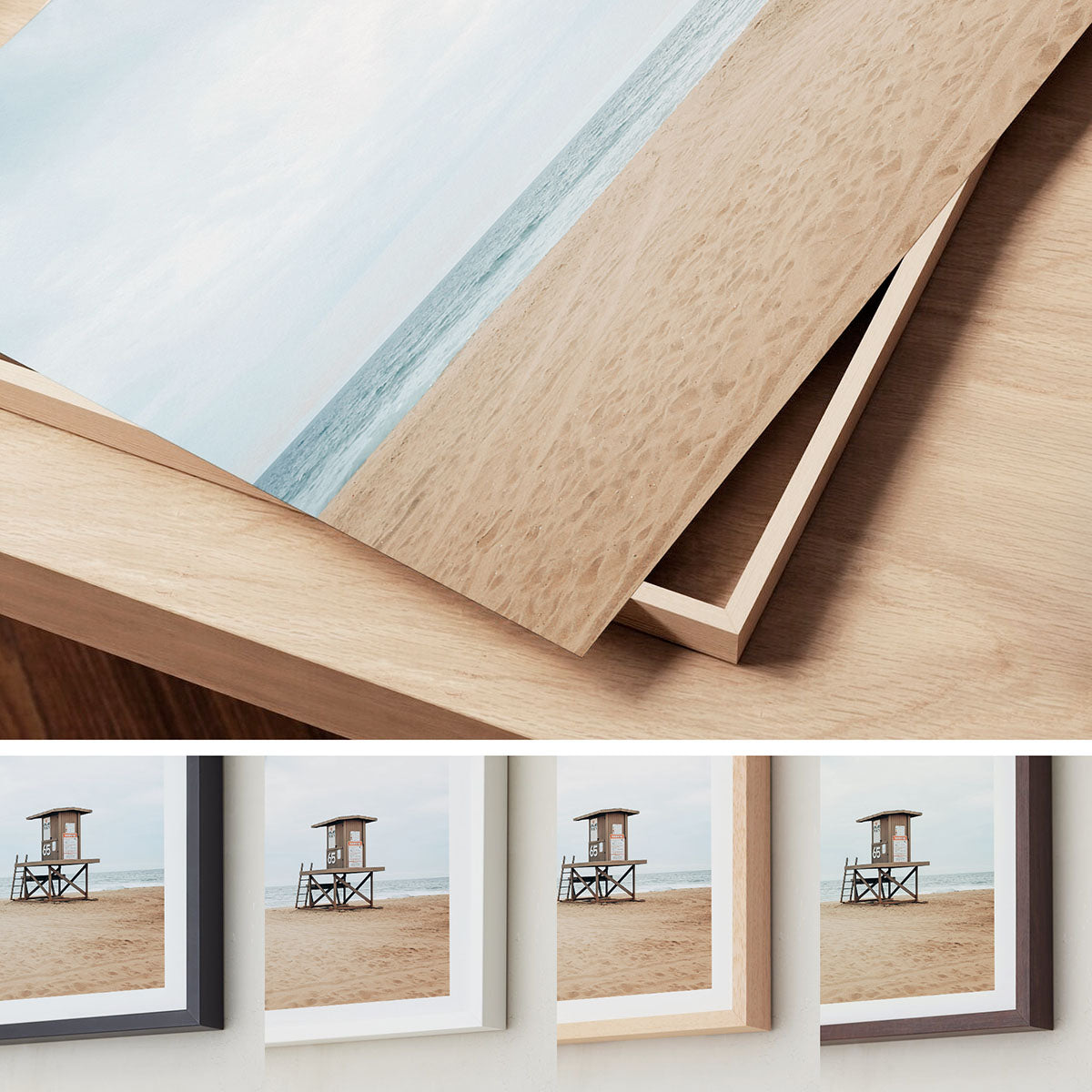 Our premium hardwood frames are expertly handcrafted from 100% natural, FSC-certified wood and are available in black, white, walnut, and natural wood finish. CLICK HERE for more details.