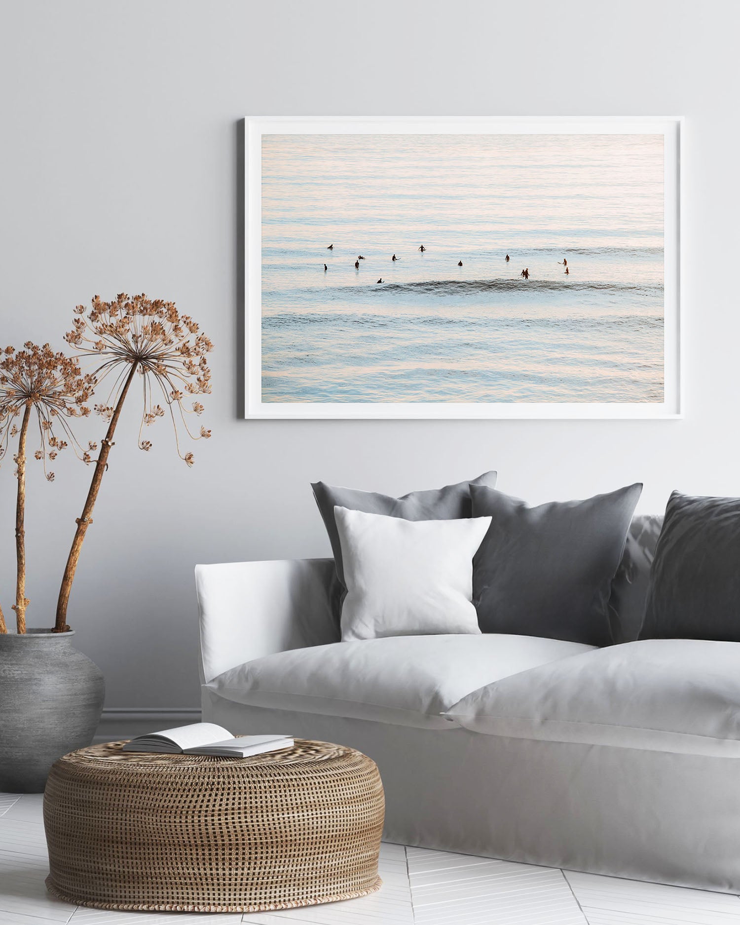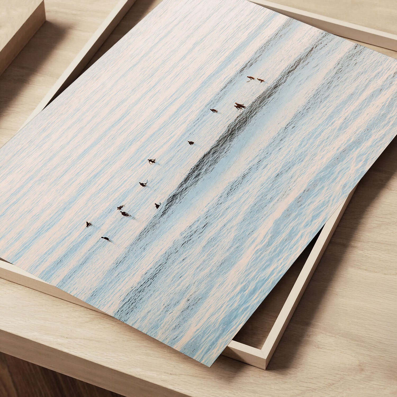 This fine art ocean sunset wall art print captures surfers beneath a glowing horizon adds a touch of serenity and timeless beauty to your walls. Designed for those who feel at home by the sea, this ocean surfers photography print brings both energy and tranquility into your home.