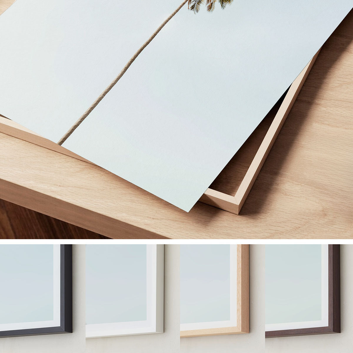 Our premium hardwood frames are expertly handcrafted from 100% natural, FSC-certified wood and are available in black, white, walnut, and natural wood finish. CLICK HERE for more details.